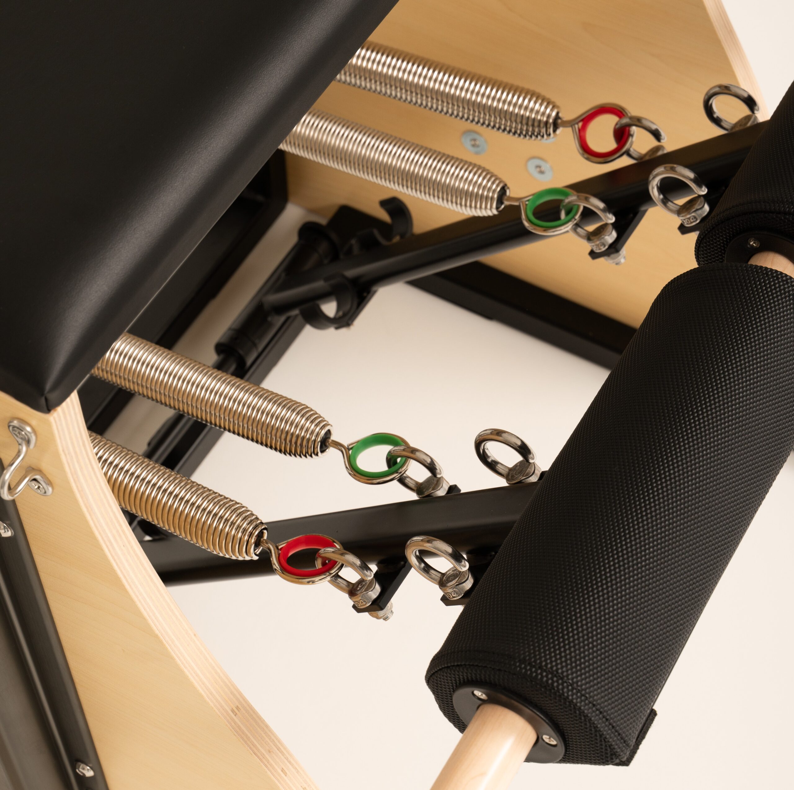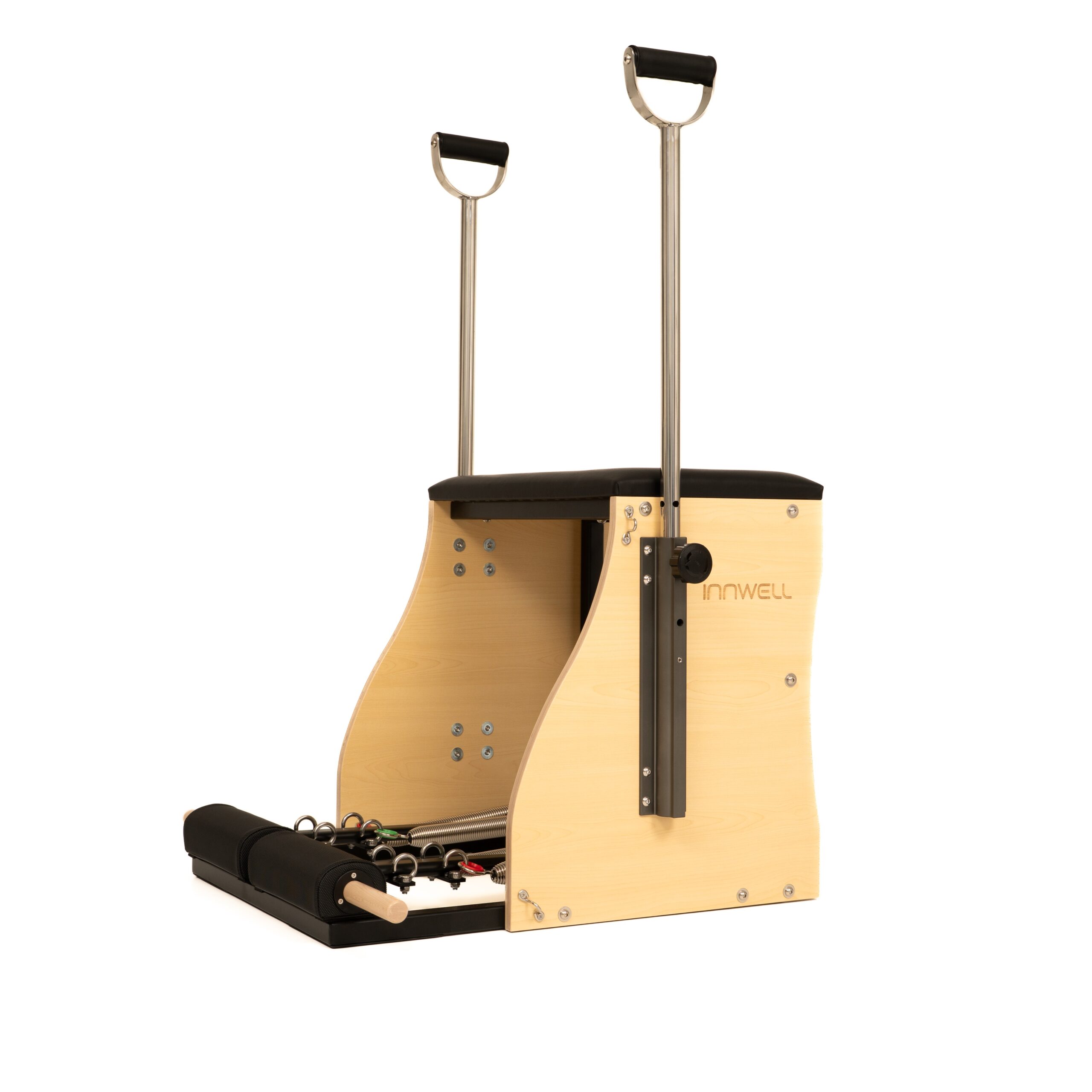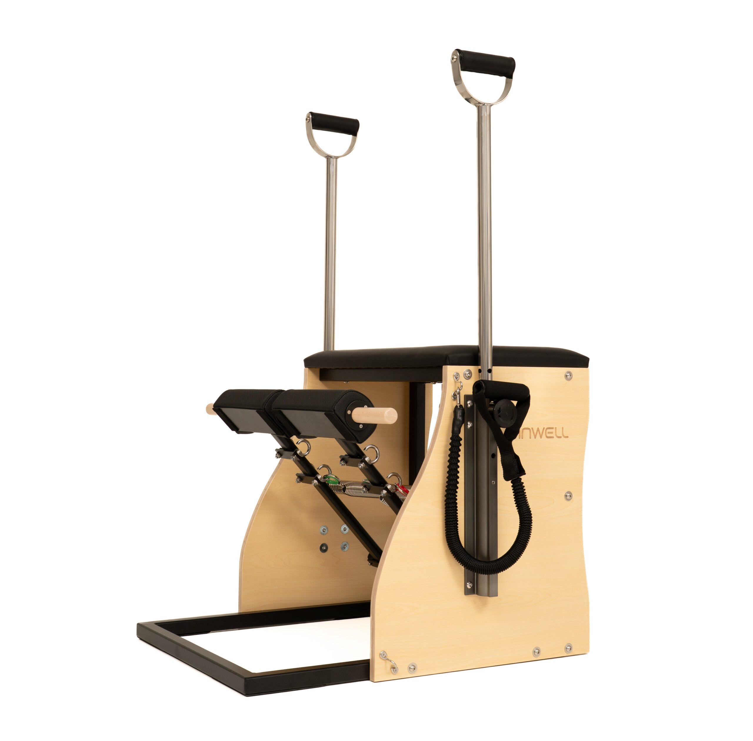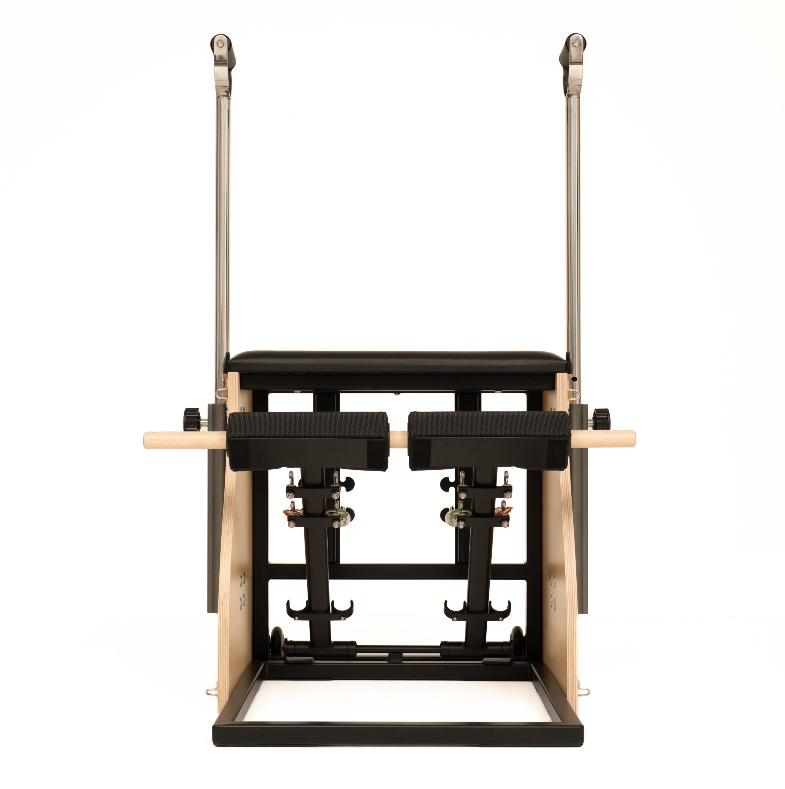 The Combo Chair with a steel base is a versatile and professional Pilates apparatus designed for intensive use in Pilates studios and physiotherapy clinics. The combination of a solid Canadian maple wood structure with a reinforced steel base ensures exceptional stability and durability, even during dynamic and advanced training sessions.